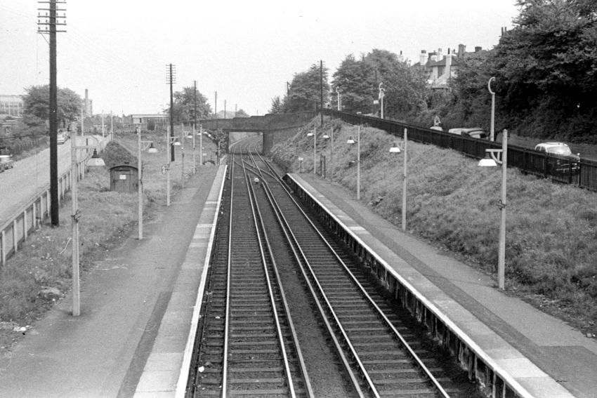 A Dartford-bound view from the footbridge shows the trailing crossover that remains a feature today and can be used to reverse trains. The concrete bracket lampposts were installed by the Southern Railway — your author suspects during the 1940s — and were complete with that company’s "Target" name signs. The "down" starter semaphore shows that the line ahead is clear. © David Glasspool Collection