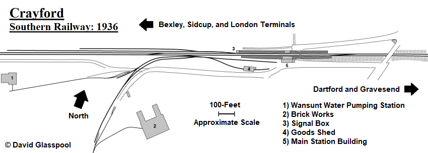 Based on the 1871 Ordnance Survey edition, no goods yard initially existed at Crayford. There was, however, a single siding immediately west of the station, which made a trailing connection with the "down" running line. By the 1897 edition, a second siding had been laid, this time on the "up" side, terminating behind the platform. At its western end, this siding curved southwards to serve a farm's gravel operation, the latter of which is mentioned in period newspaper sources: