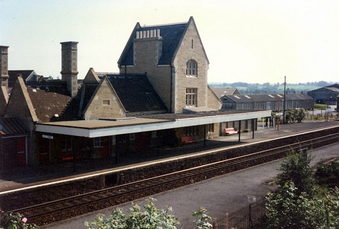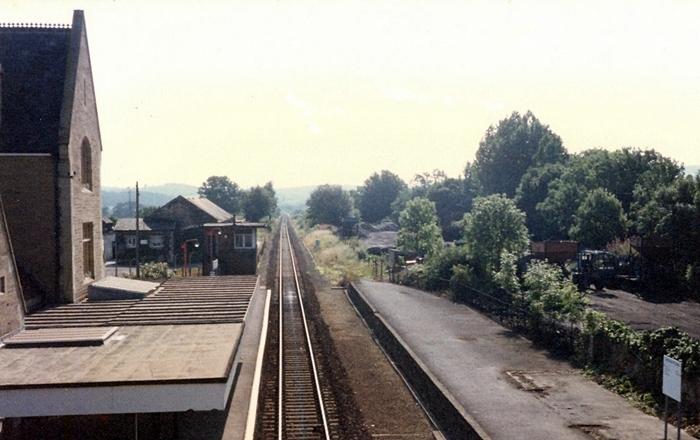 A view from 7th August 1991 shows the station building to be in very good condition, and the canopy still showed obvious evidence of the incident of 1953. Of note here are the curved windows of the top-storey, and the multitude of roof pitches. The now disused "down" platform still remains in solid condition, and can be seen in the foreground. © Mike Glasspool