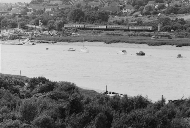 This delightful north-eastward view from September 1983 shows 4 Cep No. 1550 approaching the ''down'' platform at Cuxton, forming the Strood to Paddock Wood service. On the left can be seen the electrified freight loop installed in 1961, complete with a once electrified siding on the right-hand side. In the background can be seen the single viaduct carrying the M2 over the Medway. Today, there are now three: two for the road, and one for the CTRL. © Chris