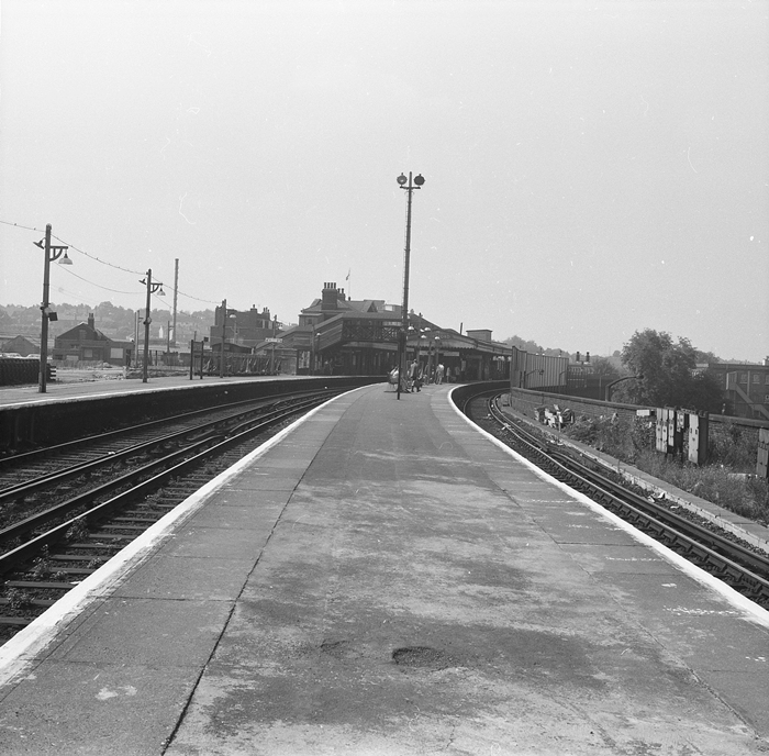 A London-bound view from the island of platform Nos. 3 and 4 shows the first signs of clearance work for station rebuilding on the left-hand side. The goods yard sidings are being lifted and the track stacked in a pile. Also on the left, in the background, can be seen the goods shed and, behind that and at a lower level, the large J & E Hall complex. Colour light signals had replaced semaphores in the year prior to this view, and the former can just been seen in the distance, at the end of the bend. A ventilated van is in evidence, parked in the ''up'' side eastward-facing bay line, which by this time was labelled platform 1. © David Glasspool Collection