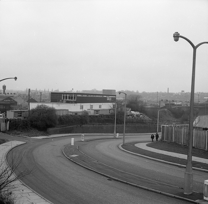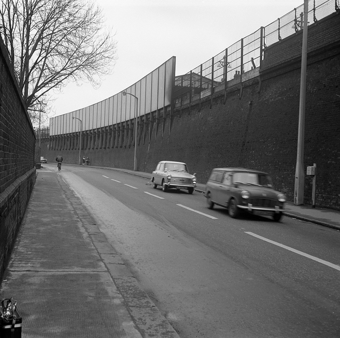 An eastward view along Mill Pond Road shows the elevated nature of the station to good effect. The sizeable timber-clad barricade, largely blocking the station from view, was taken down during station rebuilding, but the sturdy metal supports remain and today host a less imposing mesh fence. Making their way along the road are a Mini Van and an Austin A40. Beyond the wall on the left is the road's namesake and the complex of chemical firm ''Burroughs Wellcome & Co''. © David Glasspool Collection