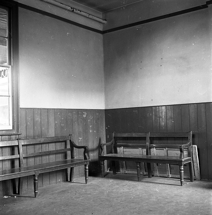 This view affords a rare glimpse inside the waiting room once sandwiched in-between the main booking office and Gentlemen's toilets on platform 2, complete with wooden benches and half-panelled wall. Through the sash-style window on the left, we can just about see the tobacco kiosk depicted in the previous photograph. © David Glasspool Collection