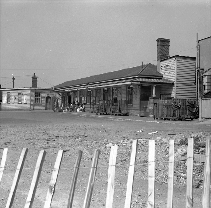 The façade of the timber booking office is seen during the very early stages of rebuilding work, which started with clearance of the goods yard. The timber clad tower on the right housed the lift shaft. © David Glasspool Collection