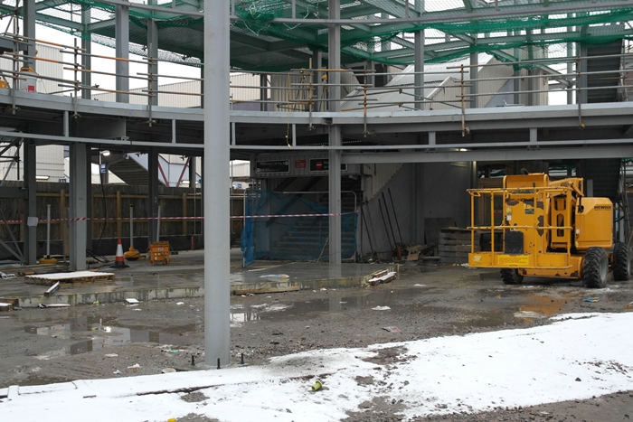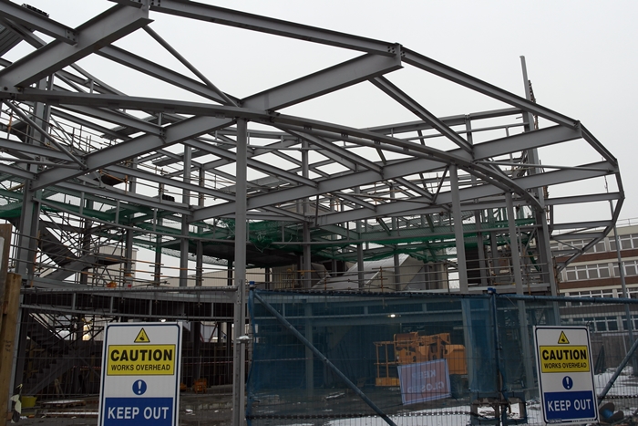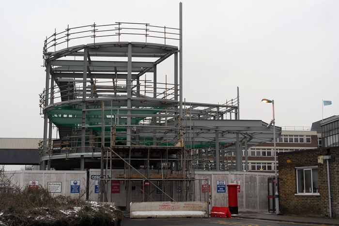Under a month after the previous photograph was taken, the framework of a large entrance canopy was taking shape along the new structure's southern elevation. © David Glasspool