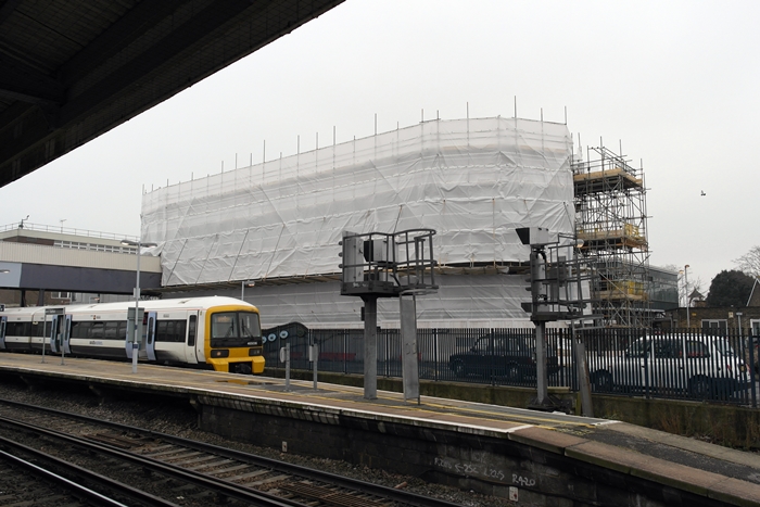The substantial framework of the new main building had mostly been engulfed by plastic sheeting by this time. Work had commenced on heightening the building by a fourth storey. On the left is Class 465 No. 465036. © David Glasspool