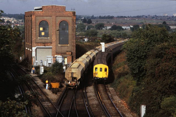 In the background of this view can be seen the ''62'' service from Gillingham to Charing Cross, formed of a 4-CAP and 4 EPB, riding over the same section of track as that of the Class 73 in the previous view. In the foreground can be seen the road widening works, forming part of the M25 construction programme. This saw the Dartford Tunnel approach road doubled in capacity. The section of road seen here under construction opened in 1986. © Chris
