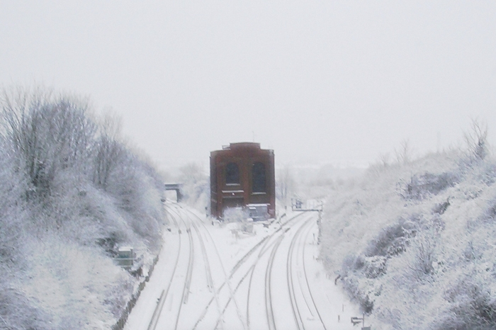 Dartford Junction in the snow. The bridge in the background, on the left, provides access to allotments, which are marooned within the triangular junction. © David Glasspool