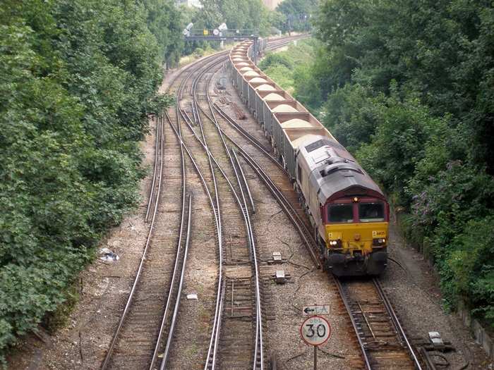 No. 66125 veers onto the Dartford Loop Line via Sidcup. The train will eventually turn onto the Nunhead line at Lewisham, and continue onwards to Factory Junction (Wandsworth Road), where the maze of lines provides access to Clapham Junction. © David Glasspool