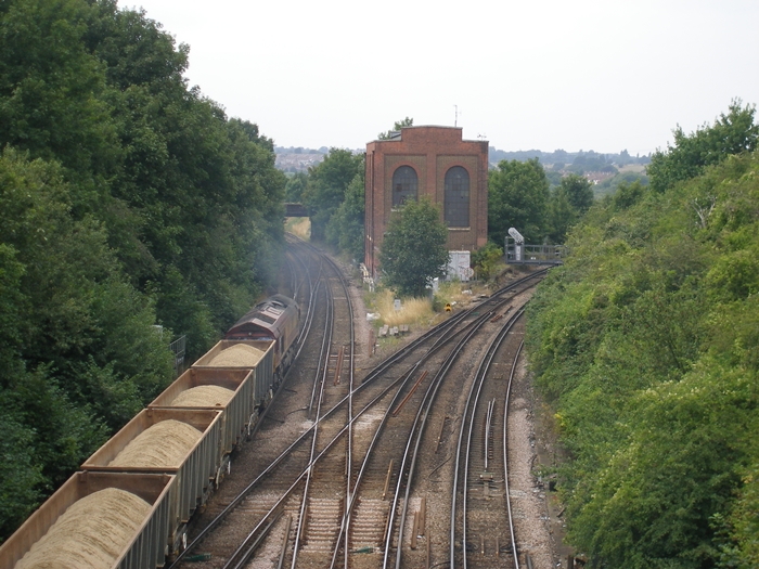 An eastward view from Dartford Junction shows the triple-track approach to the station and Class 66 No. 66125 hauling the Cliffe to Crawley sea-dredged aggregate freight. Since 1970, the centre track has been signalled for reversible running. Previously, there were two ''down'' and one ''up'' track. © David Glasspool