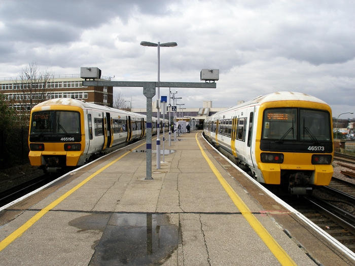 The bridge abutment on the far right marks the position of the River Darent as it passes under the railway. Prior to 1972, the platforms did not encroach on this bridge. However, rebuilding involved making new platforms which extended eastwards, beyond the river, which required bridge widening. In the background, to the left, are the council buildings which now occupy the former goods yard site. Class 465 Nos. 465196 and 465173 are forming Cannon Street and Charing Cross services respectively. © David Glasspool