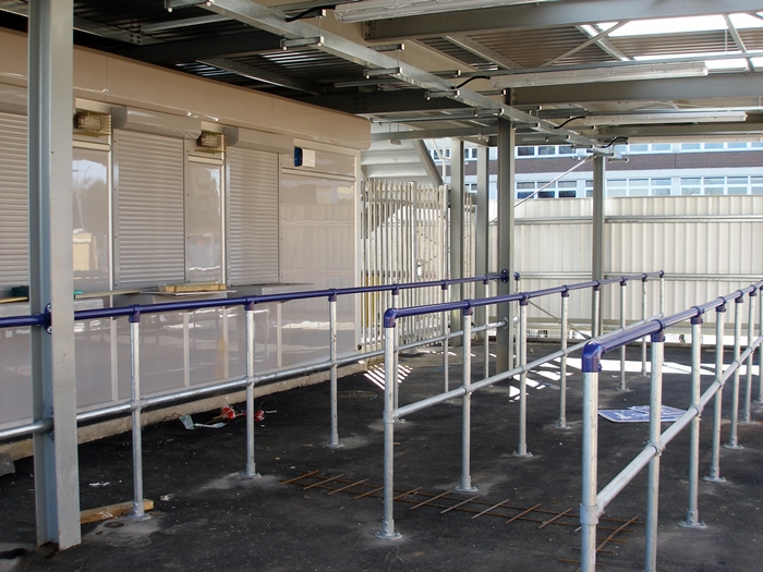 The framework of the temporary station building has now been equipped with a corrugated metal roof, and railings are now in place for the queues. © David Glasspool