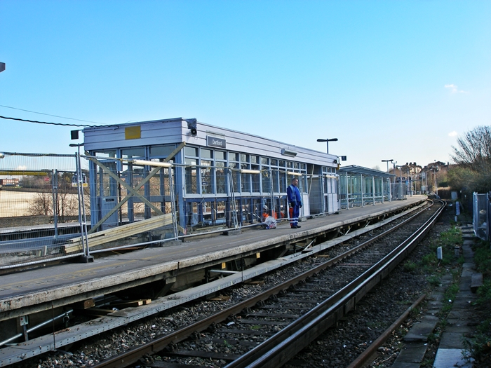 A view from the car park of the council offices shows temporary ticket booths taking shape on the right. These will apparently serve as an interim measure whilst the existing station building is demolished and a new one provided. © David Glasspool