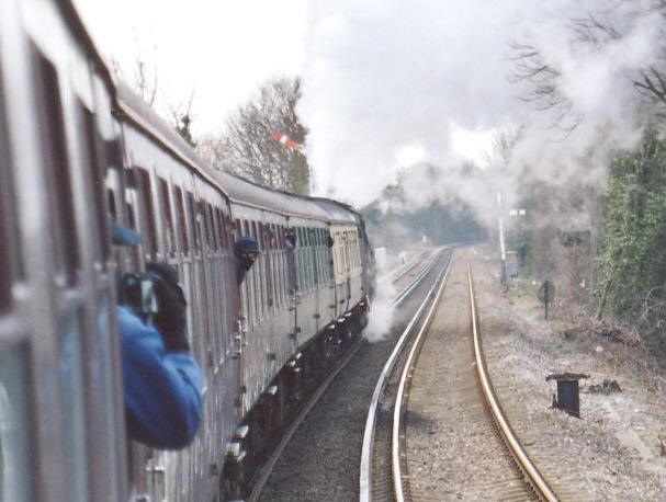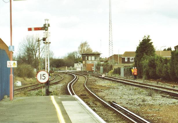 Semaphore signals also remain in place just to the south of Deal station, as this view from 25th February 2006 shows. The locomotive is ''Battle of Britain'' Class No. 34067 ''Tangmere'' and it is hauling the ''Granville Express'' circular tour of Kent. © David Glasspool