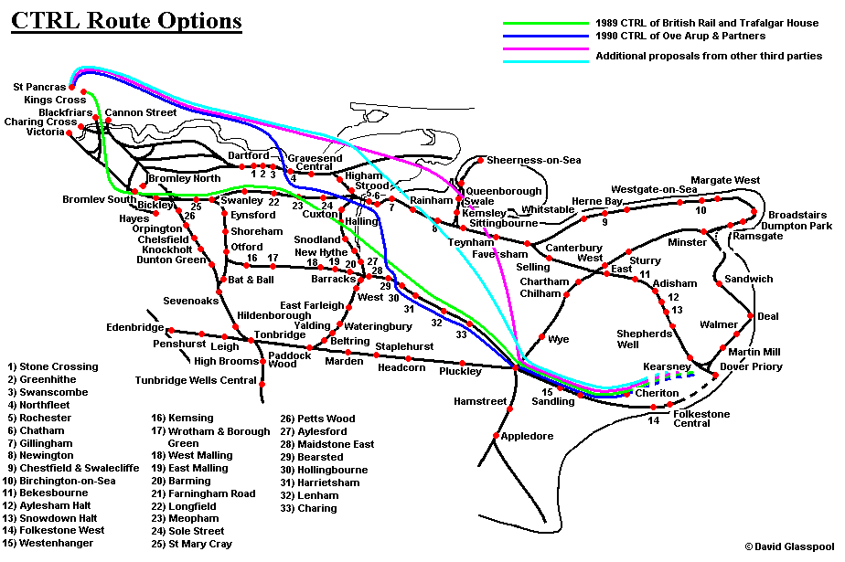 By March 1989, British Rail and British conglomerate ''Trafalgar House'' had devised a Channel Tunnel Rail Link (CTRL) which could be delivered to the Government for £1000 million, by means of a public-private partnership scheme. ''Union Railways'' was a BR subsidiary which had been established specifically to undertake the planning and building of the link line. Compared with the scheme which eventually transpired, this CTRL proposal was cheap, but it was also one which lacked sensible planning. Between the Medway and the tunnel portal, the line unveiled roughly followed the course of the route finally settled upon, but it was the CTRL's northern section in particular which was open to severe criticism. A terminal area at Kings Cross was selected as the capital's main international hub, and this was to be reached by means of a high-speed route cutting through the South East London suburbs. As a result of these plans, numerous unfortunate residents were to lose their existing homes: from the Borough of Dartford and onwards, into the London suburbia, a programme of mass demolition was to be implemented, and streets were to disappear. Under a compulsory purchase scheme, British Rail began buying residential properties, the only compensating fact for the owners being that good prices were paid by the nationalised organisation. Local resistance groups such as ''Sink the Link'' began to emerge, but as far as British Rail was concerned, the project was going ahead.