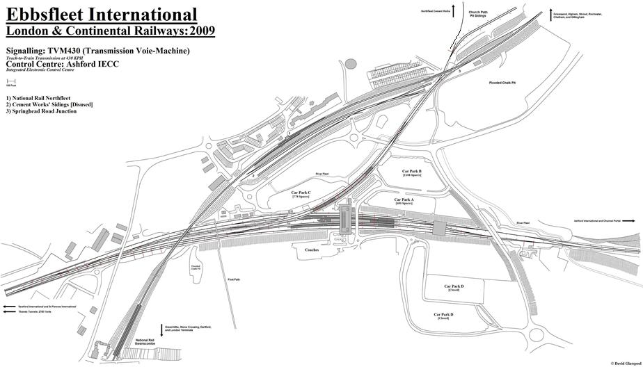 Ebbsfleet International track plan for the year 2009, including part of the North Kent Line. The disused sidings of Northfleet Cement Works also feature, despite the fact that some of the tracks nearest Springhead Road Junction were lifted during the CTRL building works. Drawn by David Glasspool