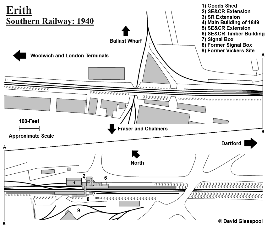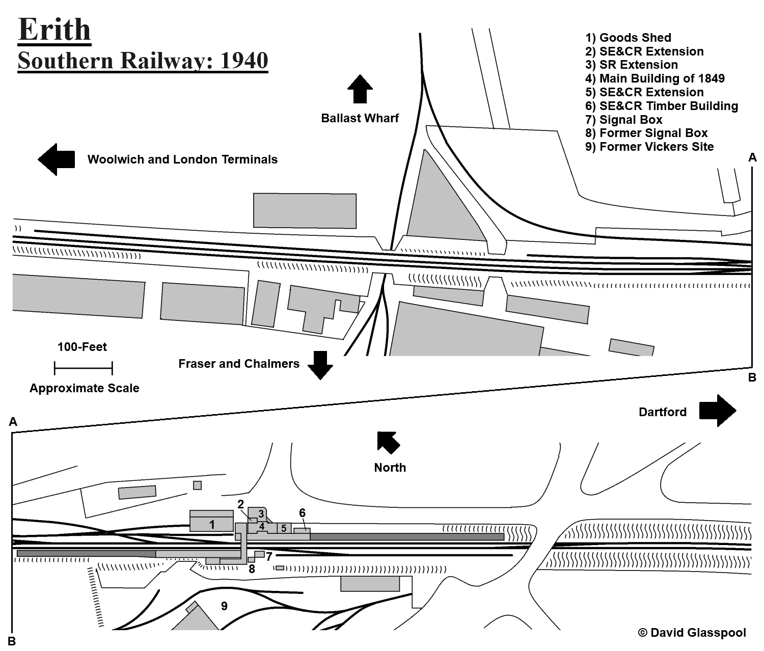 The layout is depicted after the extensive alterations made by the Southern Railway. The curve linking the main line with the ballast wharf had been laid by 1895. "Fraser and Chalmers", marked on the plan, was a mining engineering firm founded in Chicago, USA. The company started construction of their works upon a 17-acre site in Erith in August 1891 (ref: The Kentish Mercury, 28th August 1891). In the 20th May 1893 edition of "The Railway News", it was reported that their works was nearing completion. Vickers formerly had a munitions works on the western side of the railway (marked No. 9 on the plan), this having closed in December 1931. The site which became Vickers had originally been acquired in 1887 by the "Nordenfelt Guns and Ammunition Company". Click the above for a larger version. © David Glasspool