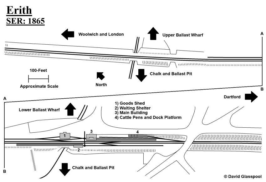 The South Eastern Railway’s (SER) North Kent Line opened to regular traffic on 30th July 1849, making through running between London Bridge and Strood via Lewisham, Blackheath, Dartford, and Gravesend possible. A station at Erith — 15-miles 64-chains from London Bridge — came into use on that date. The North Kent Line started 2½-miles south east of London Bridge, branching off from the viaduct of the London & Greenwich Railway, and proceeded 23½-miles to Gravesend. Beyond the latter, a previous concern by the name of the Gravesend & Rochester Railway (G&RR) had existed, operating a single-track line to Strood through a canal tunnel. The SER received Royal Assent on 3rd August 1846 to purchase the G&RR (ref: The Morning Post (London), 11th September 1846), after which the company filled in the canal bed through the tunnel and rebuilt the course of the line to double-track.