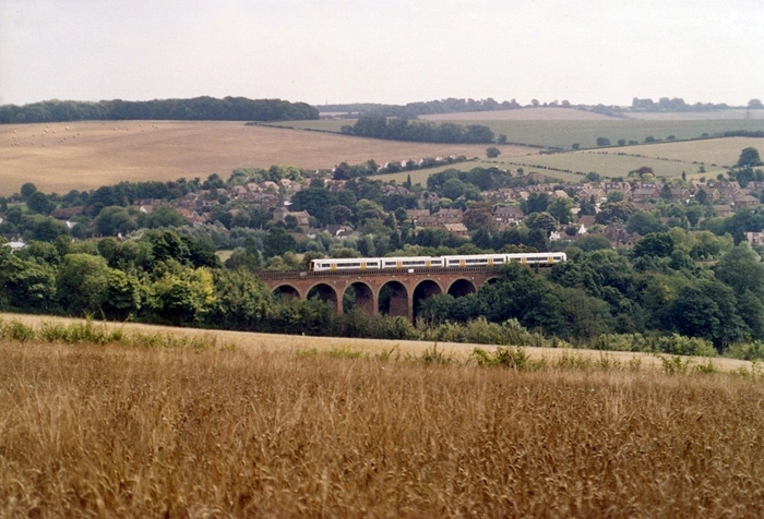 This impressive nine-arched red-brick viaduct is a prominent feature on the line to the delightfully-named "Bat & Ball" station. The structure was built by the independent "Sevenoaks Railway", incorporated in 1859 to link the "Chatham" main line with the market town of Sevenoaks. The branch was initially single-track, seeing its first services on 2nd June 1862, but the viaduct was built to accommodate two tracks from the outset, because the line was doubled in the following year. A Maidstone extension from Otford opened on 1st June 1874, this again single-track, but following in the footsteps of the original Bat & Ball line, this was soon doubled, two-track working commencing on 11th August 1875. The viaduct has nine arches of 30-foot span, and rises to a height of 75-feet above the valley.