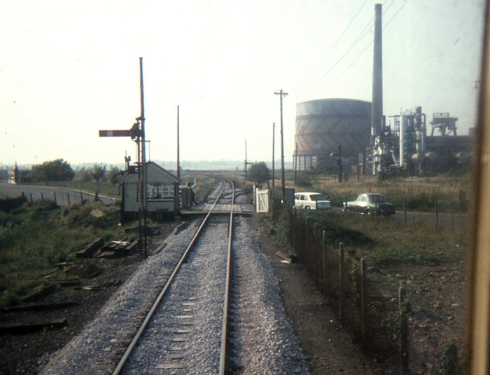 A Triumph 1300 and what looks like either a Riley 1.5 or Wolseley 1500, are seen stopped at the level crossing gates, as our train waits for the single line token with an oil train for Hoo Junction. At that time, the token would have taken the train as far as Cliffe signal box, where it would be exchanged for one to Hoo Junction. The curious siding branching off beyond the crossing, to right, went to a gas terminal. © Roger Goodrum
