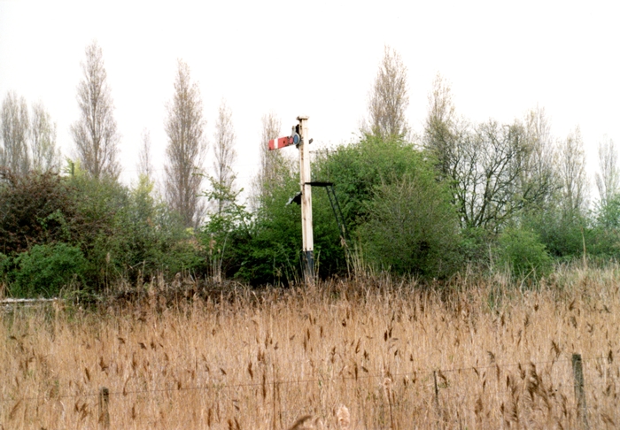 The signal post seen in the previous view is observed in this close-up on the same day. This semaphore is operated from Grain Crossing cabin's lever No. 8 and controls access to the single line token section. The sign alongside states "Commencement of Token Section". © David Glasspool