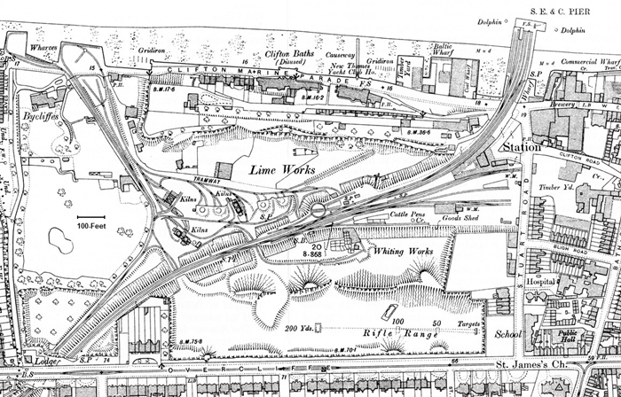 On 18th July 1881 a small independent concern known as the ''Gravesend Railway'' was established, directly instigated by the expanding London Chatham & Dover Railway. Its raison d'etre was to construct a five mile line to Gravesend, which would branch off the main ''Chatham'' line approximately 2¼ route miles east of Farningham Road (the point of divergence becoming known as ''Fawkham Junction''). Unsurprisingly, the smaller Gravesend Railway was absorbed by the LC&DR in 1883, during the line's £250,000 construction. Previously, in 1882, the smaller company had also been granted permission to modify the existing plans to incorporate a short rail extension to the edge of the Thames, where it would build a pier station allowing trains to connect with cross-river and continental steam ships. The branch to Gravesend (C&D), double-track from the outset, was formally declared open on 17th April 1886, but it was not until the 10th of the following month that passenger trains commenced. The route mileage from Victoria to Gravesend was greater than the SER's line from Charing Cross, the two comparing 27½ and 24 miles respectively. The opening of the line was not without incident, however, as unrest was brewing at the Gravesend portion of the branch: obstructions were assembled across the station threshold by local landowner, Lord Darnley. The Lord was unhappy with the permission granted by Parliament to allow the railway company to use his roads which surrounded Gravesend (C&D) station. However, the dispute was short-lived and the obstructions were removed by the railway company a matter of minutes before services officially commenced.