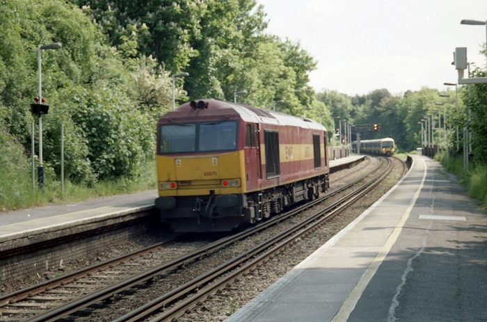 To the east of the station the double track line disappears into Greenhithe Tunnel, this stretching for 253 yards to take the railway through the chalk face and under "London Road". Greenhithe was home to the "Empire Paper Mills". The signal post seen in the background of this view marks the approximate position of the former connecting spur with the paper mills. The single-track line once continued into the now overgrown area, at 45 degrees to the North Kent Line. Class 60 No. 60071 is seen heading light engine for Hoo Junction as a train formed of two Class 465s is seen approaching the platforms with a Charing Cross service. © David Glasspool