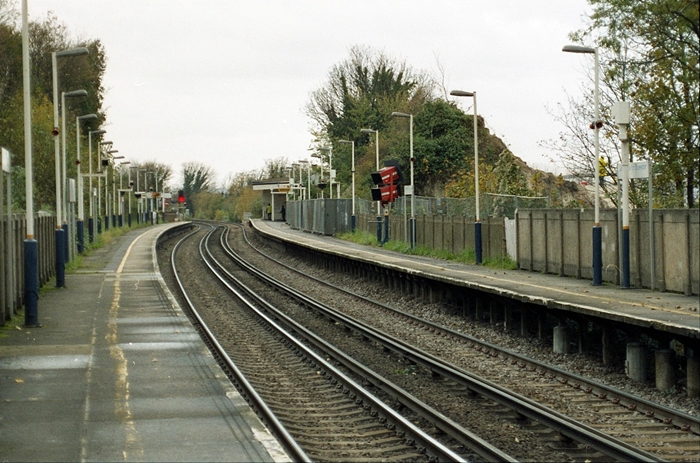 A westward view six months later shows signs of change. The greenery behind the "down" platform has been cleared to make way for a second station entrance and a new bus stop turnaround facility. © David Glasspool