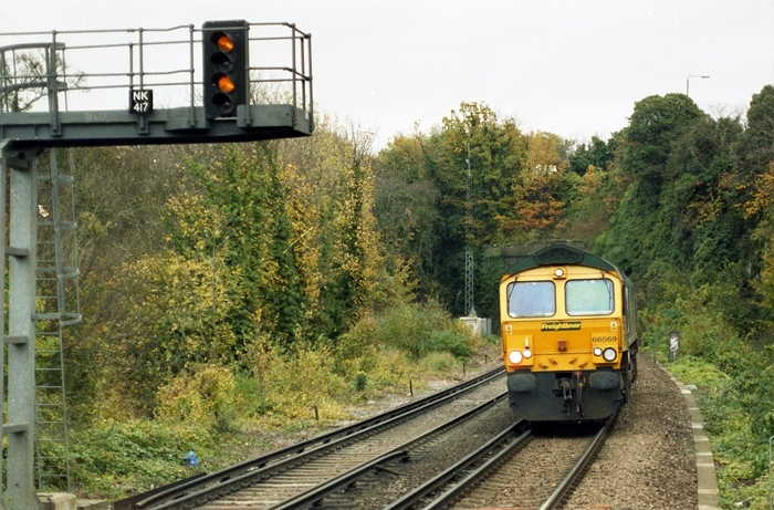 Class 66 No. 66569 is seen approaching the station on a container working from Thamesport on 10th November 2004. The overgrown area on the left side of the running lines marks the former site of the connecting spur with the Empire Paper Mills at Ingress Abbey. © David Glasspool