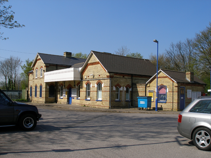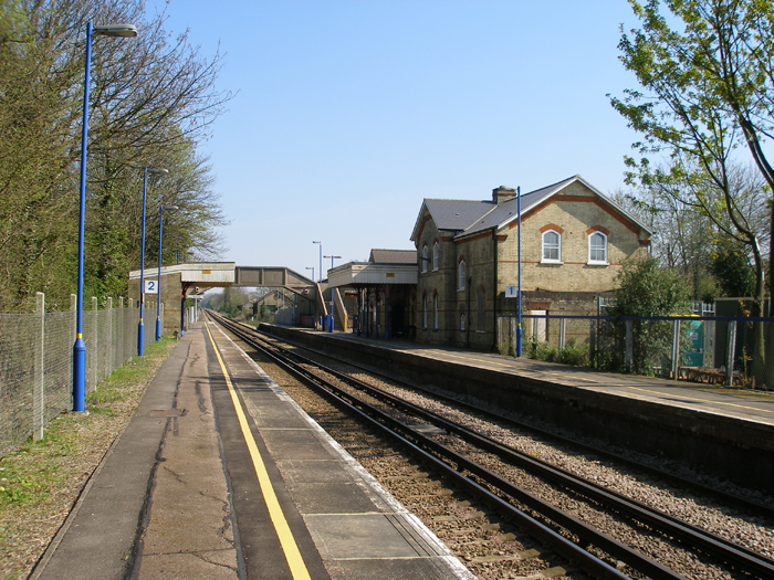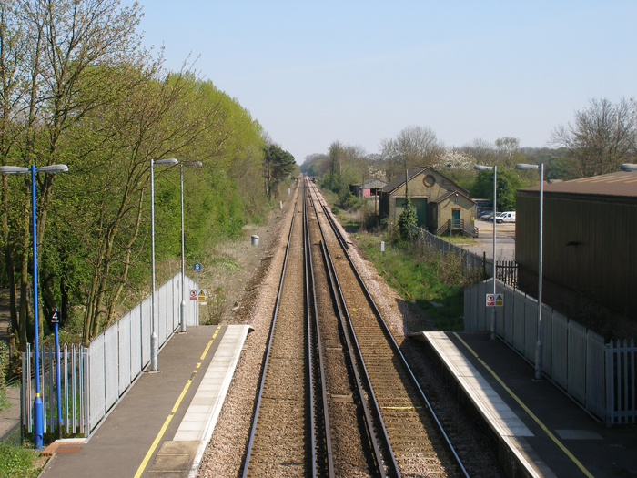 A second eastward view, this time from the footbridge, shows the former goods yard area, complete with surviving crème brick shed, and the recent platform extensions. The goods shed is of a standard design, and a similar example still exists at Bearsted. © David Glasspool