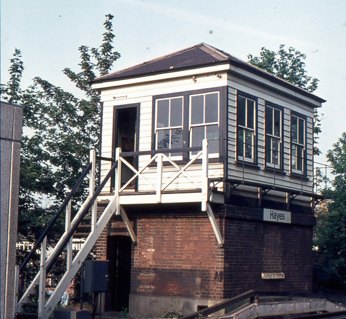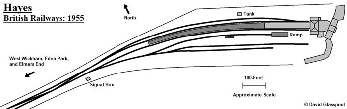 Hayes started life as a typical countryside terminus; unpretentious in construction and surrounded by flowing fields. A single platform surface comprising two faces (a “terminating island”, if you will) was in evidence from the outset, upon which was a single-storey main building of tongue-and-groove timber construction. The main building was akin to that which today survives at Eden Park, and its positioning ensured that the southern of the two platform faces was of a shorter length. The track layout reflected that of a rural station at the end of the line: a turntable and run-a-round loop were provided for terminating steam locomotives, in addition to a trio of lengthy sidings south of the platforms. A signal box was located on the throat of the station, on the northern side of the running lines. In the earliest years, a shuttle service to and from Elmers End sufficed, where connections were made for the SER’s London termini.