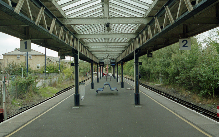 The residential development on the left of this London-bound view is partially built on the site of the former goods yard, the rest of the area being occupied by the aforementioned car park. The electrified berthing siding, which once existed beside the track of platform 2, had long been lifted, its site succumbing to vegetation. © David Glasspool