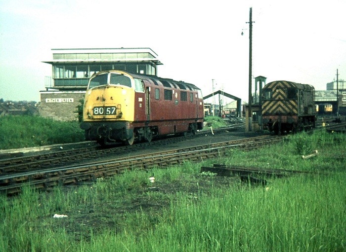 This splendid view depicting the throat of Hither Green Depot shows a D800 ''Warship'' Class visiting from the Western Region. The locomotive has been identified by Martin Street as No. D838 ''RAPID''. The head code displayed, 8057, indicated that the diesel had operated the 22:20 Severn Tunnel Junction to Hither Green freight, via Salisbury and Basingstoke. In the above view, the diesel had just refuelled and was about to depart to the marshalling yard to haul the return working, the 7V70 08:15 Hither Green to Severn Tunnel Junction. Note behind the locomotive the operational signal box and, to the right, a diesel shunter, the latter still in BR Green livery. In the background, we can just see an Electro-Diesel emerging from the former engine shed. © Roger Goodrum
