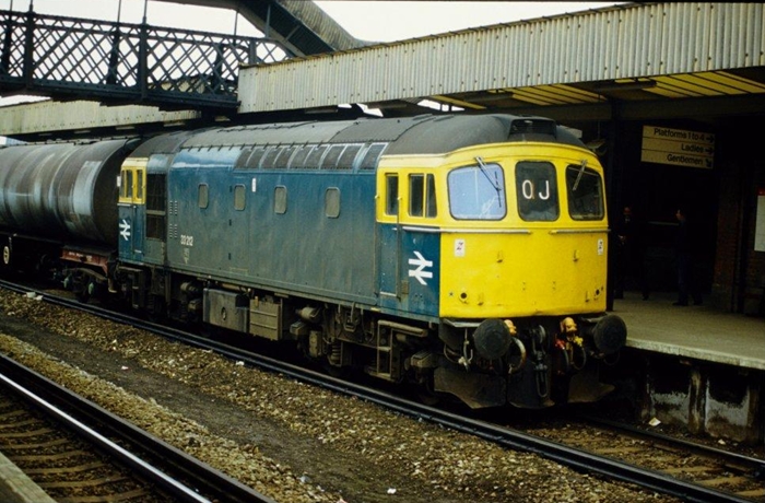 Class 33 No. 33212 is seen passing the ''up'' platform of the Sidcup lines, with what appears to be an oil train from the Isle of Grain. This was one of twelve of the class to be built to a narrower width than the rest of the fleet, for use on the ''Hastings'' line. The SER lattice footbridge dates from opening in 1895, but the depressing asbestos canopy valance dates from the 1970s station rebuild. © Wayne Walsh