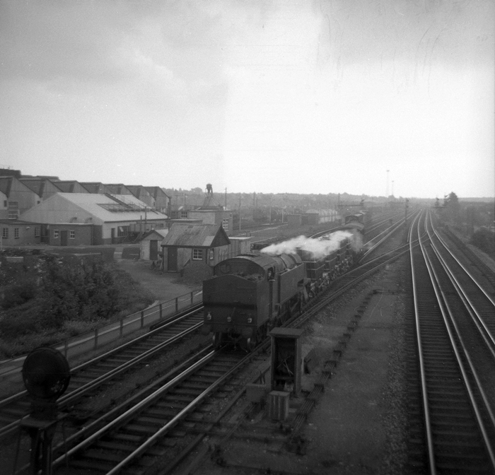 A Chislehurst-bound view from the station footbridge shows ''W'' Class 2-6-4 No. 31916 proceeding backwards out of Hither Green Depot with an assorted freight comprising hopper wagons and vans. Note the point rods in-between the two sets of double-track. The sawtooth roof on the left is that of the engine shed. © David Glasspool Collection