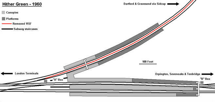 Come the late 1850s, the North Kent Line was suffering from serious cases of congestion and the SER decided upon constructing a second line between Dartford and London. This was to be routed via Sidcup and join the existing cut-off line from North Kent Junction to Tonbridge, at Hither Green. Opening of the line, dubbed the ''Dartford Loop Line'' came on 1st September 1866, providing a more direct route to the capital. A station was not built at this point of convergence until after the opening of yet a third North Kent route between Dartford and the capital, this time routed through Bexleyheath, although the line had no direct physical connection with either the Dartford Loop or Tonbridge cut-off lines. The Bexleyheath line saw its first passenger services commence on 1st May 1895 and exactly one month later to the day, a station at Hither Green was opened, serving both the suburban Dartford Loop Line and the main line via Tonbridge.
