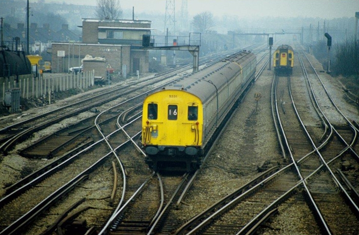 A southward view shows 4 EPB No. 5331 leading a Sevenoaks to Charing Cross service. On the left is Hither Green ''power box'', which opened on 4th February 1962. By the time of this view, it was no longer operational, having been superseded by the London Bridge Panel on 6th November 1976. It still stands today. © Wayne Walsh