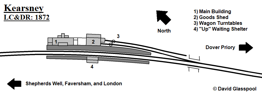 The Kearsney Spur was a 28-chain-long double-track that formed the northern side of a triangular junction between the Dover and Deal lines. In the 2nd May 1882 edition of The Kentish Gazette, it was reported that the spur was nearing completion. The contractor for the work, Mr Walker, had also laid the line to Deal, and the junction station would be Kearsney. On Thursday, 8th June 1882, the Government Inspector of Railways, Major General Hutchinson, R. E., visited the then newly-laid track of the Kearsney Spur, in the company of the LC&DR’s Chief Civil Engineer, Mr Mills (ref: The Deal, Walmer, and Sandwich Mercury, 10th June 1882). Connections with the main line were inspected and, at the time, it was reported that after some trifling matters were arranged, the spur would be certified for service. The Kearsney Spur opened on Saturday, 1st July 1882 (ref: The East Kent Gazette, 1st July 1882); the connection with the main line was called “Deal Junction”, and that with the spur from Buckland Junction was called “Kearsney Loop Junction”. On the opening of the Joint Line, the LC&DR ran six weekday trains in either direction between Kearsney and Deal, which made connections with London services at the former (ref: The Railway Magazine, July 1953).