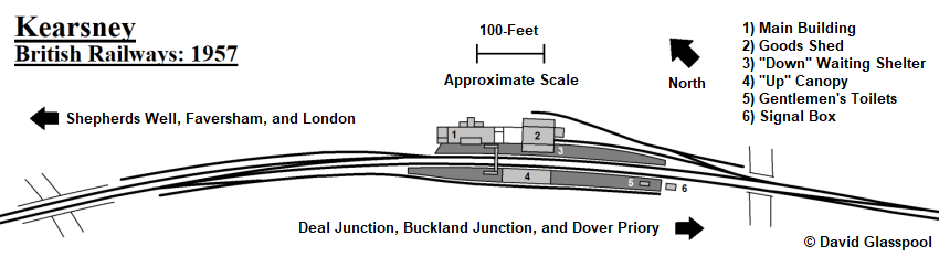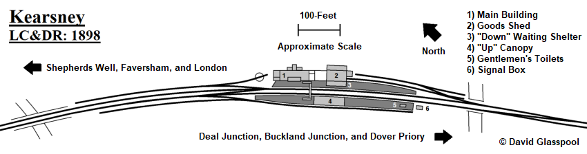 In connection with the Kearsney Spur, an additional platform face was brought into use at the station. This was formed by the opposite side of the existing “up” platform and served a terminating track facing in the Faversham direction; as the accompanying diagram shows, this platform line also provided access to a lengthy refuge siding by means of a reversing manoeuvre. Technically, the station had four platform faces by this stage: the pair adjacent to the main line; that serving the Faversham-facing track just mentioned, on the “up” side; and, finally, the opposite side of the “down” platform’s southeastern end, which served that track feeding the goods shed. Whether the latter was genuinely used for passenger purposes during its lifetime is debatable. Further station modifications included the provision of a pitched roof canopy on the “up” side, underneath which were timber offices, and a brick-built and roofed gentlemen’s toilet block at the Dover end of the same platform. On the “down” side, a cuboid-shaped timber waiting shelter — with a flat roof, wraparound sides, and no valance — was erected, the rear of this sitting immediately adjacent to the wall of the goods shed. Finally, passengers no longer had to cross the tracks on the level, for a lattice footbridge was erected between the platforms.