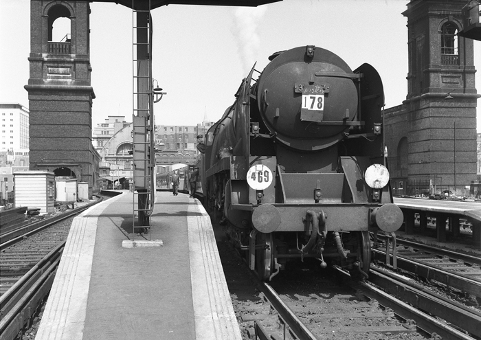 The once lofty environs of Cannon Street can be appreciated in this view, which includes the framework of the trainshed supported upon huge walls. The platform canopies in the background protected passengers from the elements, given that the roof had lacked glass since World War II bombing raids. The platform lighting was of the concrete bracket type. An N1 Class 2-6-0 is seen at the head of Blood and Custard Maunsell stock, either Ramsgate or Dover-bound, which will be routed via Chislehurst Junction, Gillingham, and Faversham. The EPB on the left is on a Selsdon or Sanderstead working, the 4 SUB on the right is forming an Orpington service, whilst the EPB on the far right is for Dartford via Bexleyheath. Note that the platform is timber planked as it extends onto the railway bridge. © David Glasspool Collection
