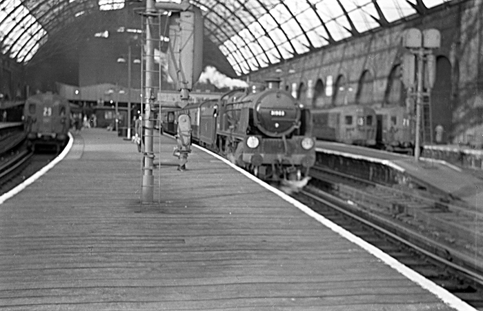 The station is seen immediately before dismantling of the splendid trainshed commenced, which unfortunately had been bomb damaged during World War II. The signal box, which can be seen on the bridge, to the left of the furthest tower, was once double its length. A fire in the relay room earlier in the year was severe to the extent that half of the signal box was demolished and a replacement lever frame installed. The latter had been supplied by the Midland Region. © David Glasspool Collection