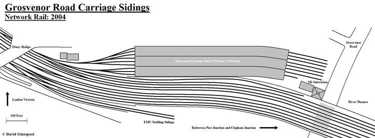 Track layout of the Grosvenor Road approaches to London Victoria in 2004, including carriage shed and berthing