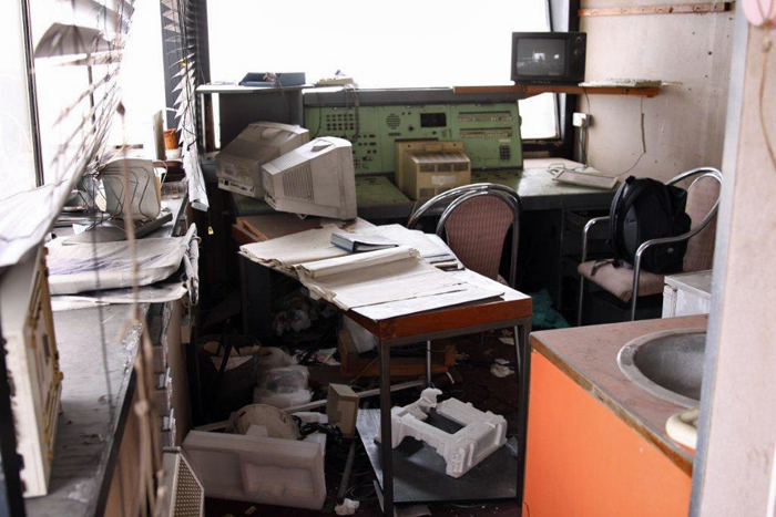 Stepping back from the previous photograph, the former announcer's room looks like Beirut. Three life-expired computer monitors and a veteran television set complete the derelict scene. © Wayne Walsh