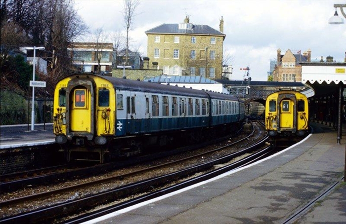 Two unrefurbished 4 CEPs are seen at the station during the transition from semaphore signals to colour lights.