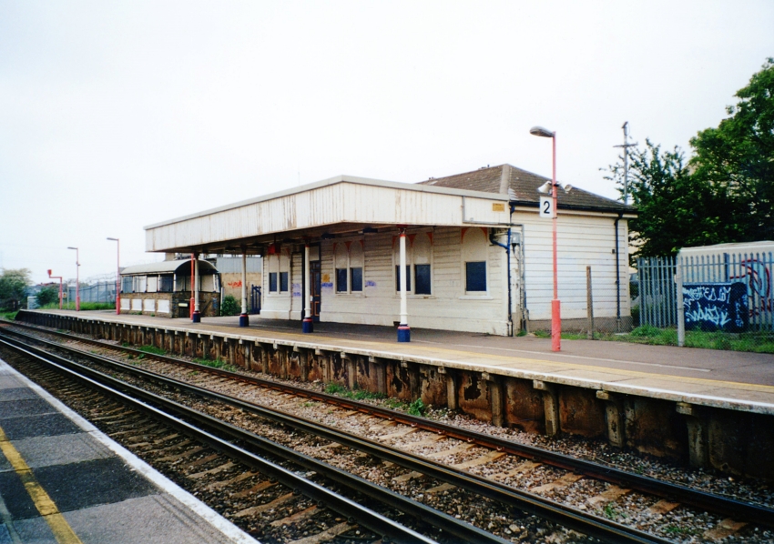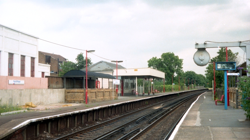 This modest station has had an interesting and varied history. It was opened by the SER with the whole North Kent Line between London and Strood on 30th July 1849, comprising a standard layout of two staggered platforms and a single-road goods shed. Like its counterparts at Dartford and Greenhithe, the station was graced with an imposing two-storey high brick-built main building, this of which was located on the ''down'' side, although the structures at all three locations were very much different in design. Northfleet's main building could fairly accurately be described as a small version of that still in existence at Greenwich, even though it predates the latter by some twenty-nine years. The SER was still constructing solid buildings at the time, most of the stations along the original North Kent Line via Blackheath and Woolwich being beneficiaries, although Strood is notable as being clapboard from the outset (the company's own through station opening in 1856). It would seem that later on in the same century, Northfleet was to join the league of the timber stations when, in 1891, its main building was demolished and replaced by a standard SER economical wooden affair on the opposite (eastern) side of the subway entrance. The reasons for the company doing away with the original building so soon are not obvious, but there are perhaps a couple of clues. It would seem that on post-1891 maps, an additional siding spurs off from the goods shed (located on the ''down'' side, just beyond the station building) that at least passes over part of the site of the original 1849-opened structure. However, demolition of a large building to accommodate a single siding would seem extreme, thus it is likely that there are other factors at play here. The clapboard structure appears to be in a prime position where two roads culminate, these leading straight to its entrance (still according to period maps), compounded by the fact that the timber building's façade is not facing directly towards the frontages of the houses opposite - the pre-1891 building would have done. In conclusion, later developments may have indicated that a repositioning of the main building was more convenient and desirable - both to the railway company and local residents - therefore demolishing the whole lot and installing a clapboard structure was the cheapest way of doing it. Worthy of note is the fact that the SER's later wooden building at Northfleet was assembled by means of a tongue-and-groove system, rather than the earlier trademark clapboard arrangement (the latter of which had overlapping, sloping wooden planks).