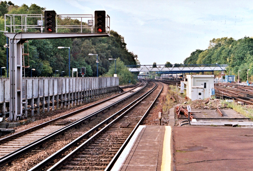A London-bound view shows evidence of the 1992 platform lengthening to accommodate twelve-car "Networker" formations. Designed to tackle overcrowding, authorisation to run suburban services of this length was never eventually given under British Rail, in spite of the platform works at numerous stations. The scheme was revisited in 2013, when several stations on the North Kent routes and that between Charing Cross and Orpington had their platforms lengthened. In this latest case, twelve-car trains did commence. The "AD" code alongside the four-aspect colour lights denotes signal control from Ashford. © David Glasspool