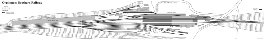 Being at the end of the quadruple-track section of the Tonbridge cut-off line, in addition to forming the southern limit of the intensive commuter operation, the range of facilities on offer at Orpington were extensive. The goods yard of the original station, which merely consisted of a single northward-facing siding trailing off the ‘’up’’ line, was retained, but significantly enlarged. In total, eight sidings came into use on the ‘’up’’ side of the running lines: three of these trailed off at the same angle of ten degrees, as per the old layout, with one track of the trio passing through a single-track goods shed. The latter was a solidly-built brick structure, being two-storeys in height with a slated pitched roof, and was identical in appearance to the example which emerged at the rebuilt Chislehurst station. The goods yard was also host to a long line of coal staithes and a group of cattle pens (all descriptions thus far are later illustrated in diagram form). The ‘’down’’ side of the layout boasted an even greater range of tracks: three carriage sidings were laid alongside the bay line, virtually matching the latter in length. Furthermore, four southward-facing carriage sidings, of considerable size, came into use to the north of the platforms. The cutting at this point was accommodating nine parallel tracks: four were the aforementioned ‘’down’’ carriage sidings, another four formed the main line, and a single southward-facing siding was in evidence on the ‘’up’’ side, seemingly existing as an extension of the goods yard. Since the railway incurred on a public footpath here, a lattice footbridge of over 200-feet in length was erected across the tracks. Finally, although covered in a separate dedicated section, worthy of mention is the engine shed which was established here. This was a brick-built through affair, comprising a slated pitched roof and accommodating two northward-facing tracks. The depot complex was positioned on the ‘’down’’ side, upon a site situated in-between the bay platform sidings and the four southward-facing carriage sidings, and was intended to serve those tank engines – particularly classes ‘’H’’ and ‘’R’’ – which were deployed on commuter services. The engine shed layout was equipped with a 55-foot turntable, which could not only rotate those terminating tank engines of the suburban services, but was also large enough to accommodate the majority of the existing SE&CR tender engine fleet.
