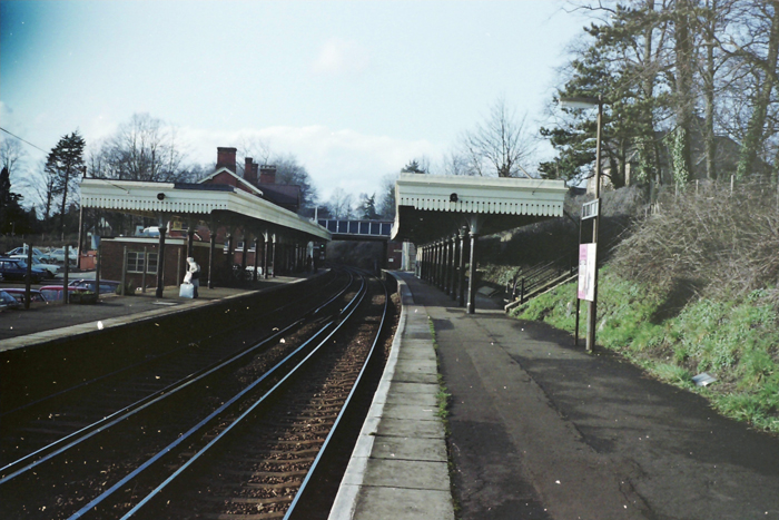 A northward view from the "down" platform shows the splendid canopies still in evidence, but the roofed footbridge having been replaced by a simple concrete type. Steps linking the "down" platform to a high-level footpath can be seen on the right. © Kevin McArdell