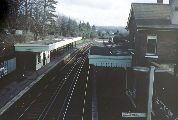 Although it could possibly be considered that the station’s decline began when the bay line went out of regular passenger use, the closure of the goods yard is more convincing as the first major cutback. This occurred in May 1962, the month before the full electric timetable through to Ashford commenced. The closure of the signal box followed in February 1970, when the nearby cabin at Otford Junction assumed its responsibilities, semaphores also disappearing at this time. More changes were on the cards during the 1970s: these included the removal of the original footbridge, installation of a soulless replacement to the north of the main building, and the flattening of the goods yard site to provide additional car parking space. In about 1986, there was a general rationalisation of platform structures: the ‘’down’’ canopy was totally removed and that on the ‘’up’’ side severely truncated, it now just stretching the width of the station building. A plain section of valance was attached to the end of the reduced length, and a single bus shelter replaced the former copious canopy on the ‘’down’’ side. A bus shelter had also appeared on the ''up'' side to compensate (somewhat poorly) for the loss of canopy coverage. It was claimed that the canopies had become unsafe due to damage from water freezing inside the cast iron columns – no doubt this was a convenient excuse for demolition and reduction in maintenance costs, as there appeared little wrong with them at the time of removal. The degrading saw a section of Otford's ''up'' canopy reused at nearby Shoreham. It was also at this time that much of the main building had been leased out to private businesses. In connection with this, the structure became roughly symmetrical when the northern ⅓ of it, which had been single-storey from the outset, received a second floor. The latter was constructed in sympathy with the rest of the building.