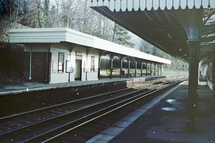 At platform level, a closer inspection of the splendid platform canopies and timber-panelled "down" side waiting room are afforded. Note the intricacy of the cast-iron canopy brackets. © Kevin McArdell